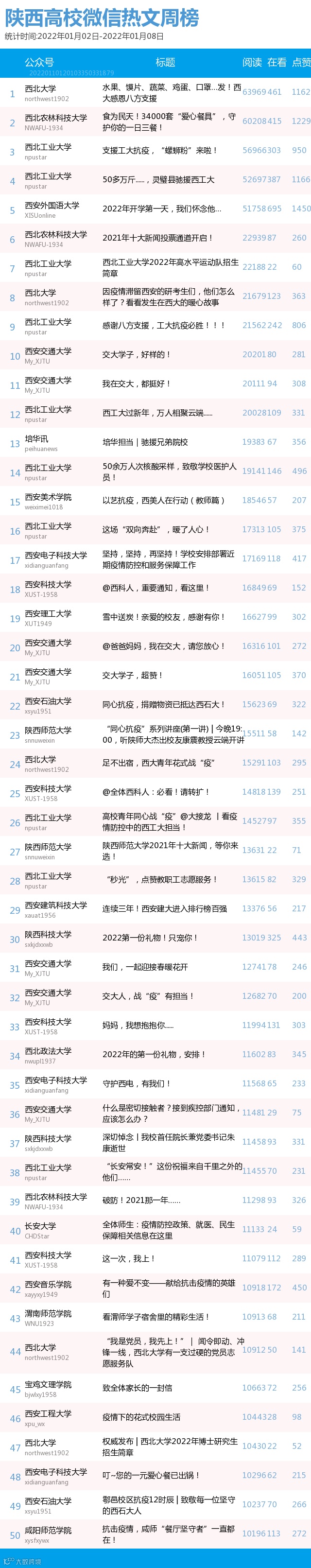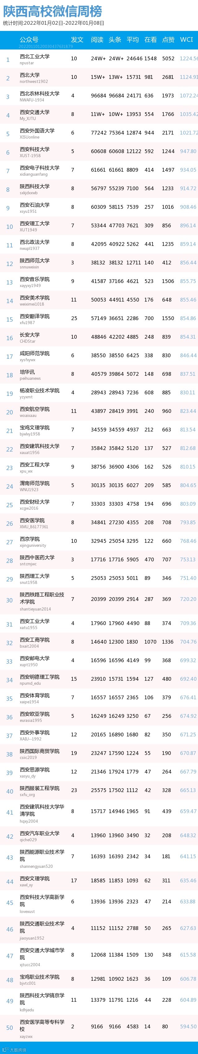 最新陕西高校微信公众号50强重磅出炉!TOP50上周共计发420篇,贡献阅读总量203+,在看总量1万+,阅读数据较上周有所下降,希望各大平台下期继续加油哦~(查看榜单可直接下滑)