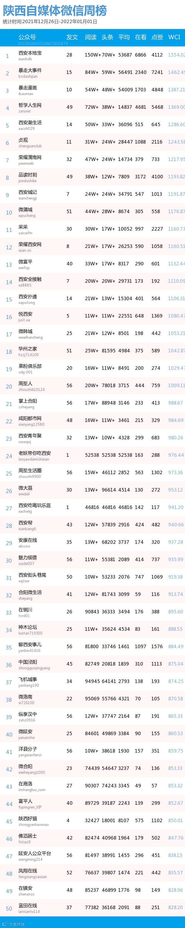 最新陕西自媒体微信公众号50强重磅出炉!TOP50上周共计发文1645篇,贡献阅读总量1108万+,在看总量3万+,阅读总量较上周有所下降,希望下期各大平台加油哟~(查看榜单可直接下滑)