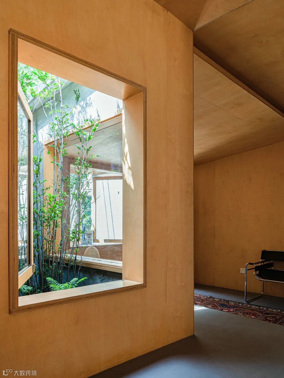 我把家乡老旧的烧火墩打磨后,拿来作为踮脚的木桩,穿过天井的三角区再下两节台阶,会有一种进入私密空间的仪式感。