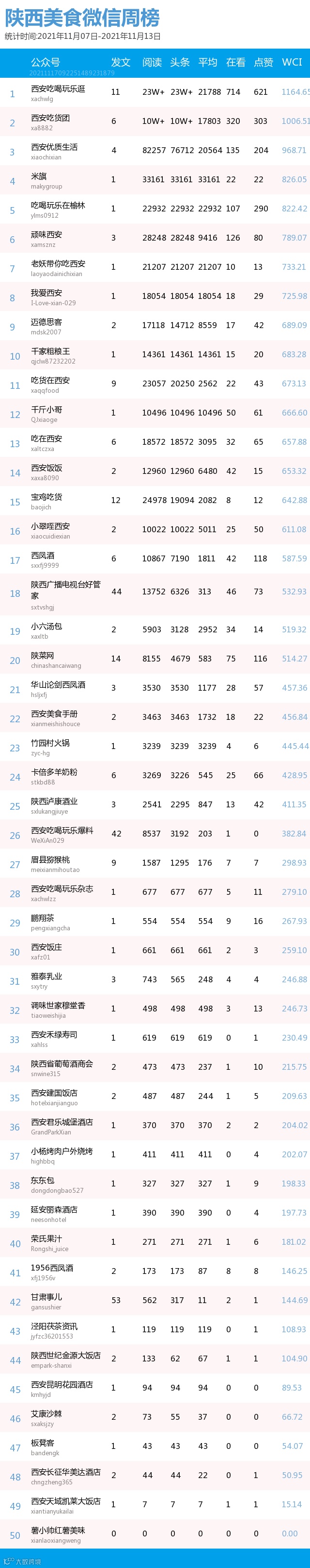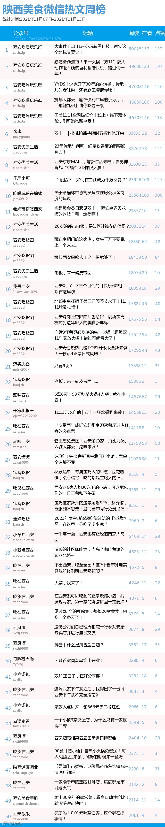 最新陕西美食类微信公众号50强重磅出炉!TOP50上周共计发文277篇,阅读总量达到73万+,在看总量达到1997。阅读总量较上周有所上升,希望下期各大平台再接再厉!(查看榜单可直接下滑)