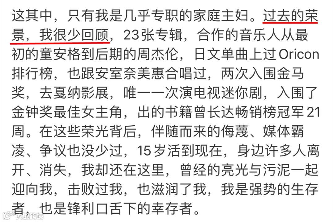 她说社交媒体并非本人,而是闺蜜模仿自己的口吻在打理,也对自己在采访中发表的关于梅艳芳的言论表示了歉意。
