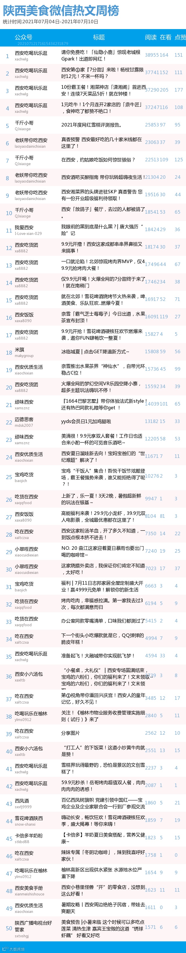 最新陕西美食类微信公众号50强重磅出炉!TOP50上周共计发文220篇,阅读总量达到63万+,在看总量达到2027。阅读总量较上周有所上升,希望下期各大平台再接再厉!(查看榜单可直接下滑)