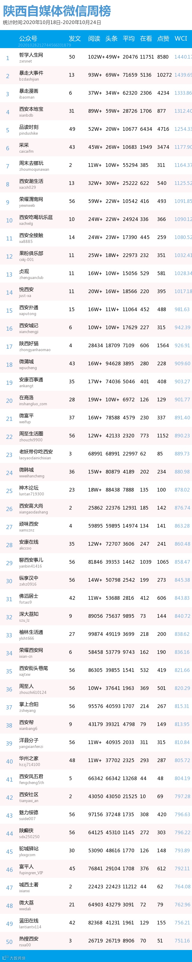 最新陕西自媒体微信公众号50强重磅出炉!TOP50上周共计发文1386篇,贡献阅读总量970万+,在看总量4万+,各项数据较上周有所下降,希望下期各大平台加油哟~(查看榜单可直接下滑)