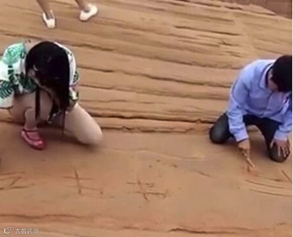 2018年7月8日,两男一女在丹霞地貌上乱刻乱画。