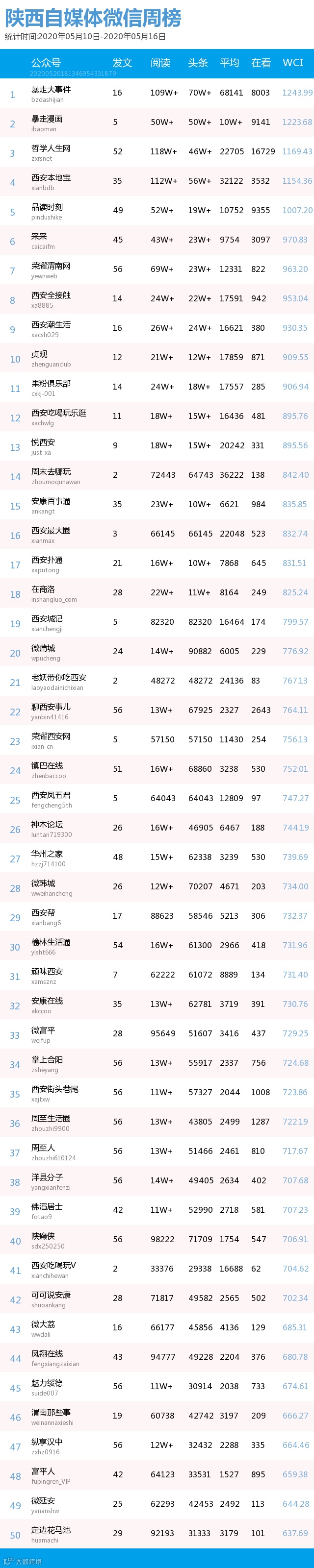 最新陕西自媒体微信公众号50强重磅出炉!TOP50上周共计发文1506篇,贡献阅读总量1086万+,在看总量7万+,各项数据较上周有所上升,希望下期各大平台加油哟~(查看榜单可直接下滑)