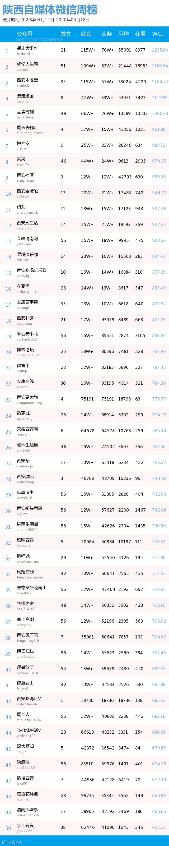 最新陕西自媒体微信公众号50强重磅出炉!TOP50上周共计发文1463篇,贡献阅读总量1097万+,在看总量7万+,各项数据较上周有所上升,希望下期各大平台加油哟~(查看榜单可直接下滑)