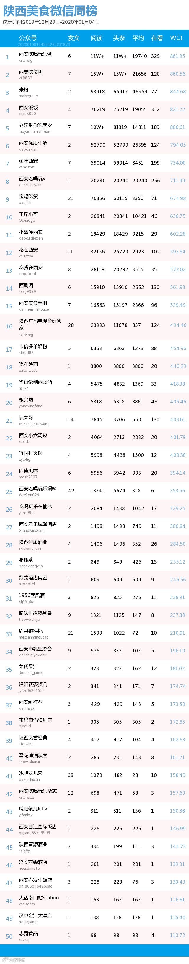 最新陕西美食类微信公众号50强重磅出炉!TOP50上周共计发文335篇,阅读总量达到96万+,在看总量达到2794。阅读总量较上周有所下降。希望各大平台下期再接再厉~(查看榜单可直接下滑)