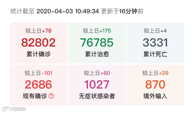 截止到2020年4月3日10时,因为疫情逝世的人们已达3331例。