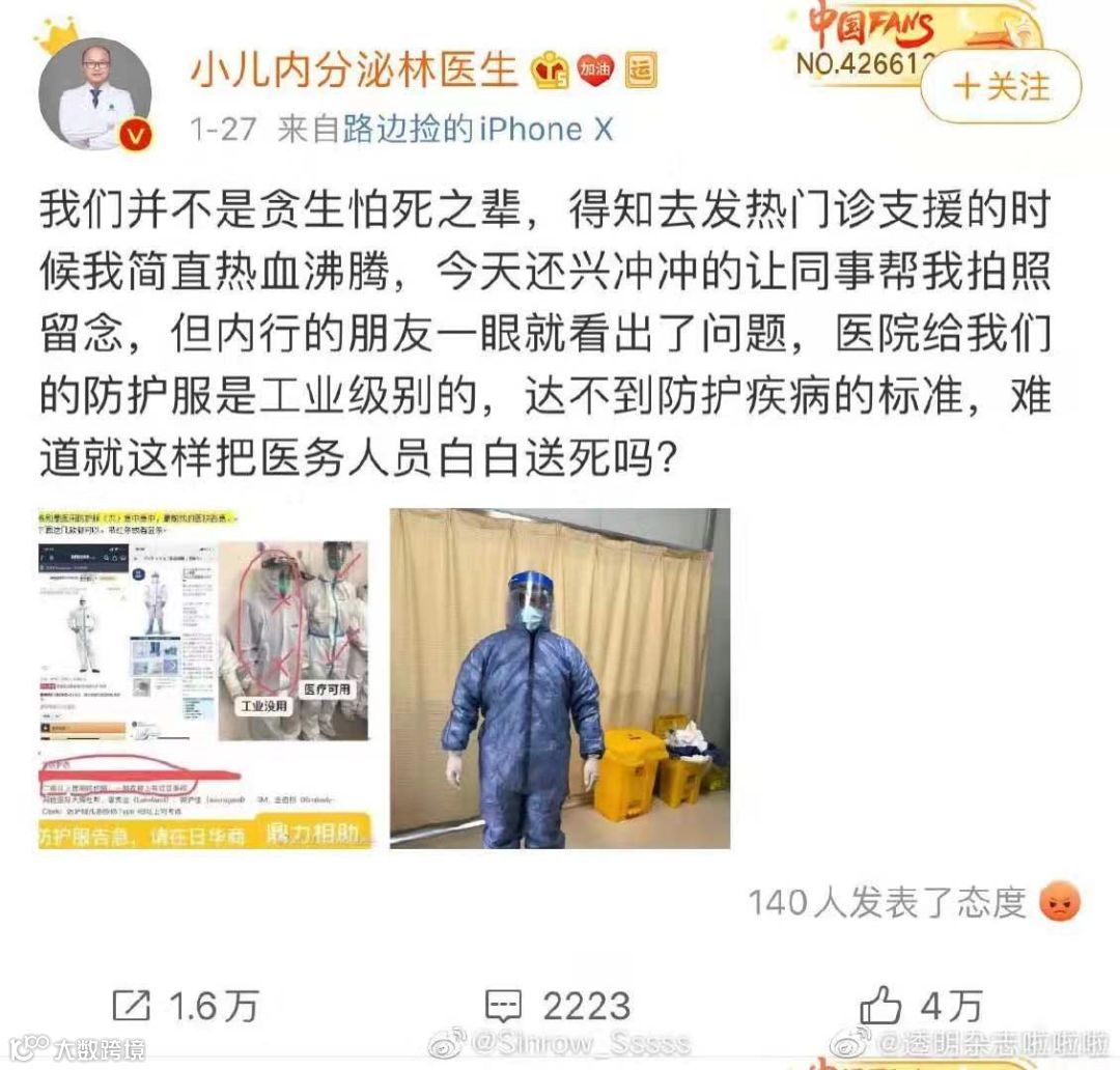有其他科的医生调去发热门诊支援,医院给的防护服是工业级别的,达不到防护疾病的标准。