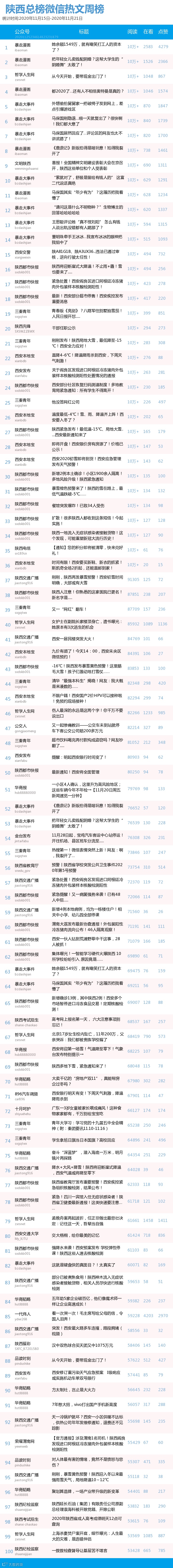 最新陕西微信公众号总榜周榜100强重磅出炉!TOP100上周共计发文3021篇,阅读总量达2639万+,在看总量10万+。各项数据相比上期有所上升,希望下期各大平台再接再厉!(查看榜单可直接下滑)