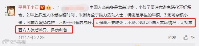 又一个不知从哪冒出来的,名为“平民王小石”的微博大v带节奏,恶意解读他说的“不能喝粥”这个点,把张文宏拉出来骂。