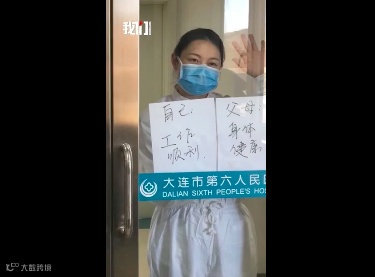 除夕夜,坚守战场的护士,隔着隔离区的玻璃门,用卡片写下对简短的新年祝愿。