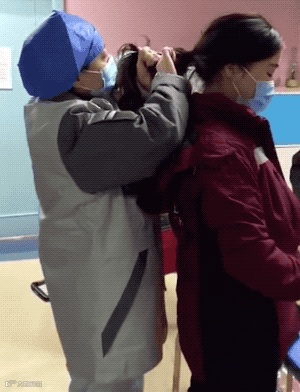 敬业的她顾不得担心自己,只怕一头长发会影响穿防护服......