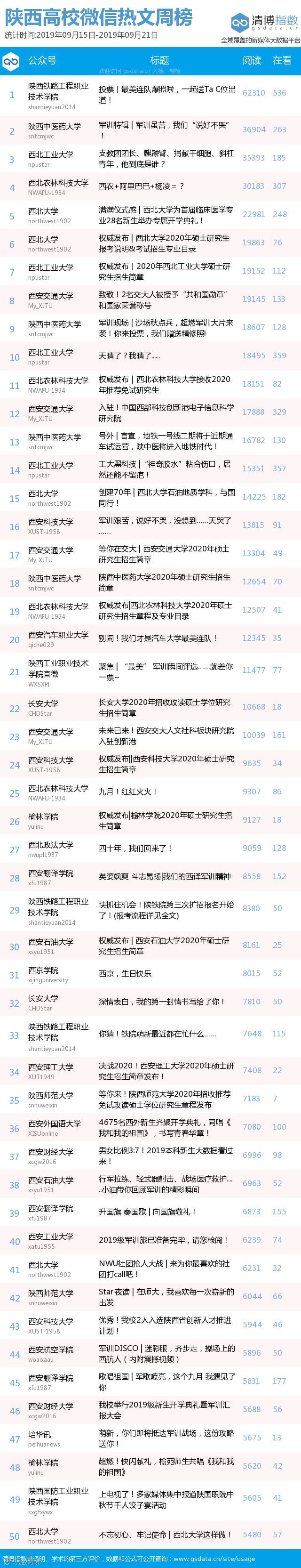 最新陕西高校微信公众号50强重磅出炉!TOP50上周共计发文241篇,贡献阅读总量102万+,在看总量8956,数据较上周均有所下降,希望各大平台下期加油哦~(查看榜单可直接下滑)