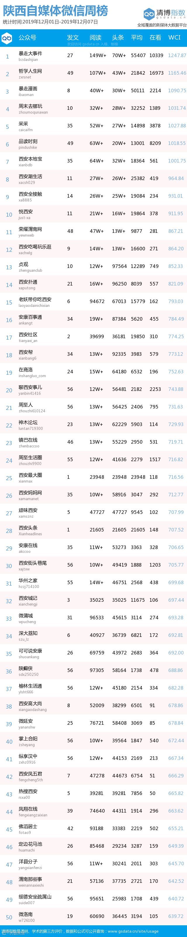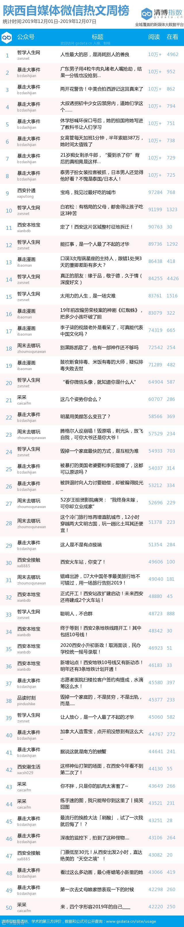 最新陕西自媒体微信公众号50强重磅出炉!TOP50上周共计发文1455篇,贡献阅读总量994万+,在看总量6万+,各项数据较上周有所上升,希望下期各大平台加油哟~(查看榜单可直接下滑)