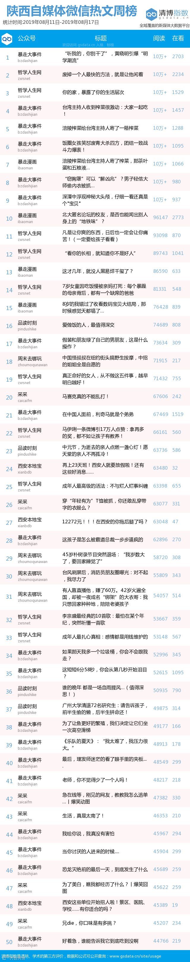 最新陕西自媒体微信公众号50强重磅出炉!TOP50上周共计发文1419篇,贡献阅读总量1069万+,好看总量6万+,贡献阅读总量较上周有所下降,希望下期各大平台继续努力~(查看榜单可直接下滑)