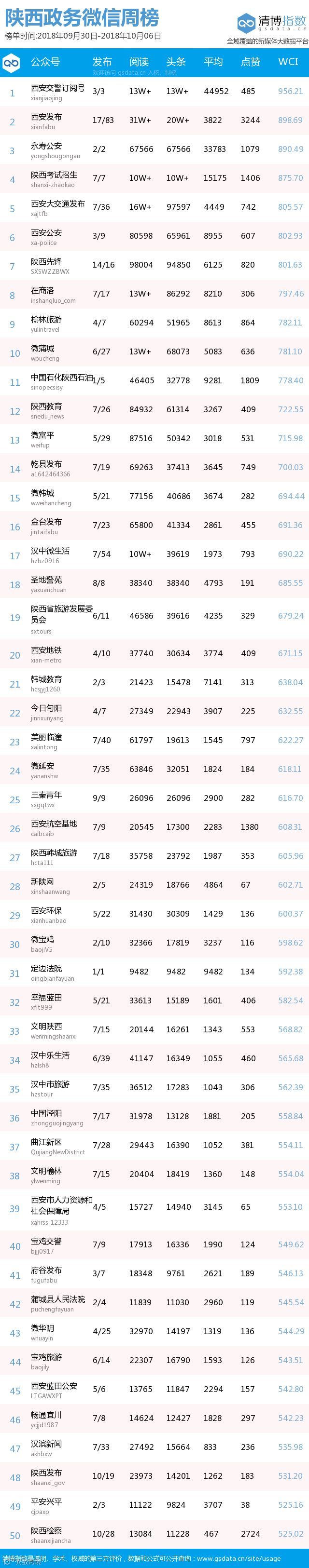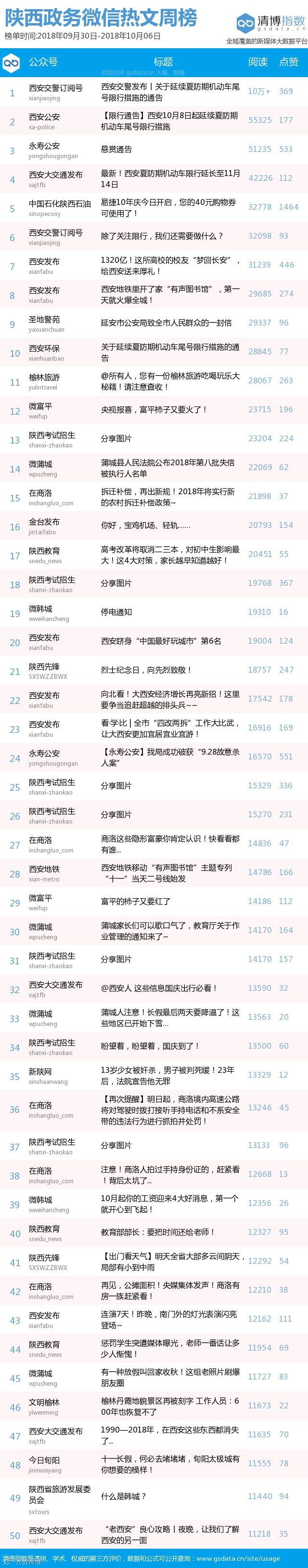 最新陕西政务微信公众号50强重磅出炉!TOP50上周共计发文903篇,阅读总量达271万+,点赞总量26986,本周数据相较上周有所下降,希望下期各大平台能继续加油!