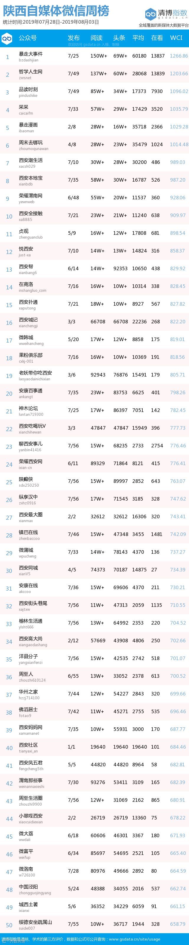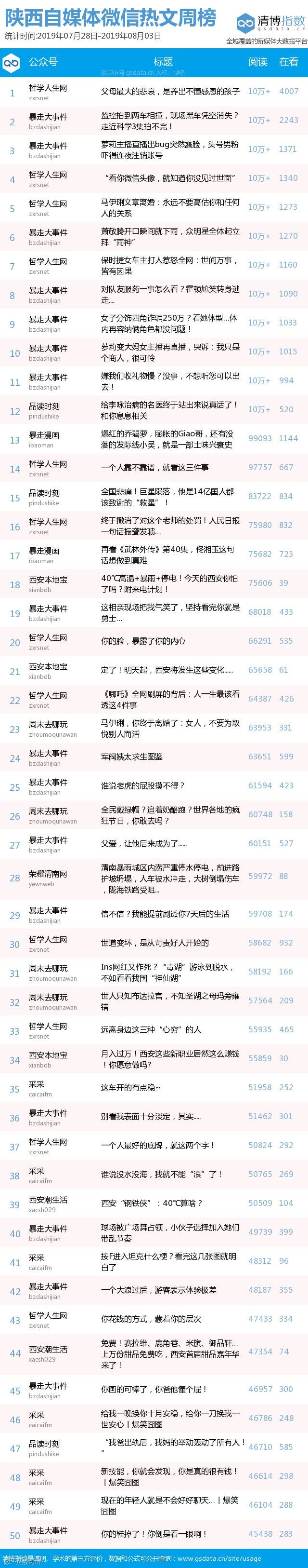 最新陕西自媒体微信公众号50强重磅出炉!TOP50上周共计发文1380篇,贡献阅读总量1095万+,好看总量6万+,贡献阅读总量较上周有所上升,期待下期各大平台有更好的表现~(查看榜单可直接下滑)