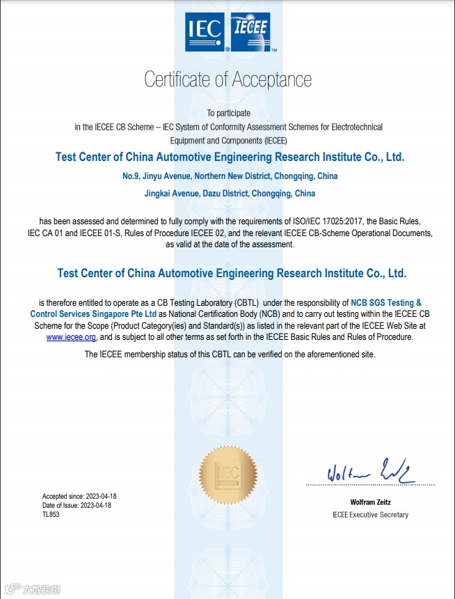 该证书的获得标志着中国汽研成为IECEE的认证实验室(CBTL)并可开展电池类相关出口认证测评业务,同时加速了建设国际化、高水平实验室的进程。