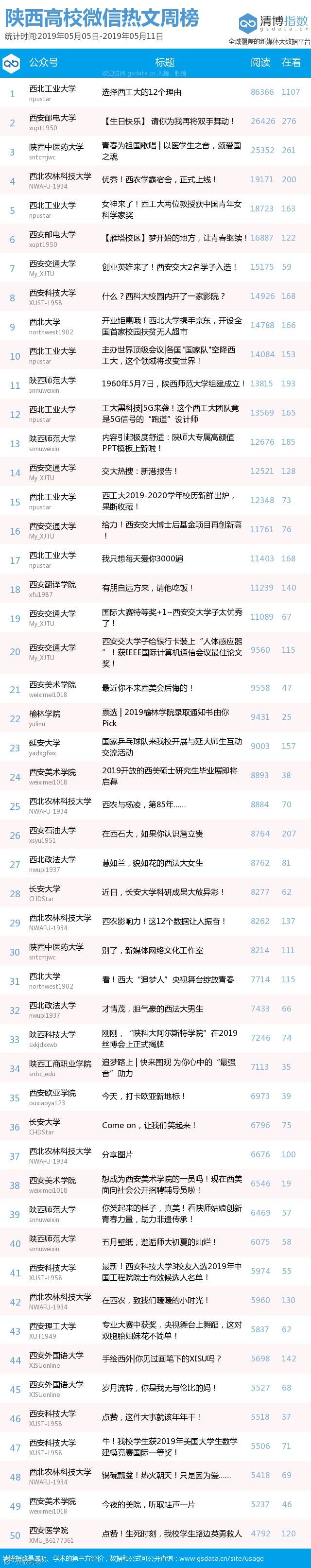 最新陕西高校微信公众号50强重磅出炉!TOP50上周共计发文263篇,贡献阅读总量89万+,数据比上期均有所上升,在看总量9714,与上期数据相比有所下降。总体来说,本周的表现还是很棒的,期待各大平台下期继续加油哦。(查看榜单可直接下滑)