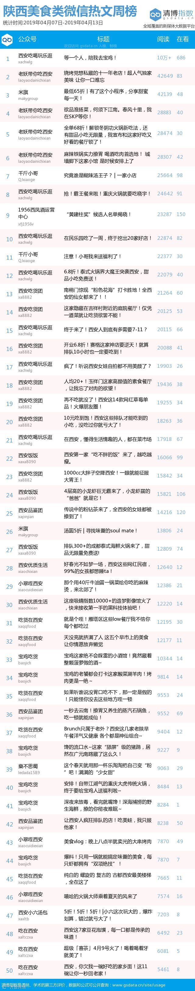 最新陕西美食类微信公众号50强重磅出炉!TOP50上周共计发文297篇,阅读总量达到99万+,好看总量达到3364。数据相比上周有均所上升,期待下期各大平台继续加油哦!