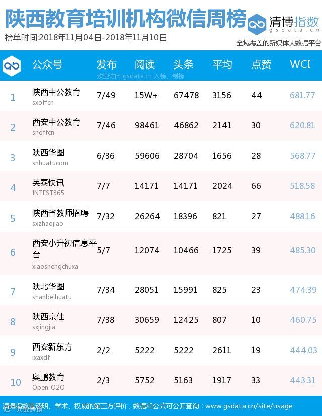 ● 本期陕西教育类新媒体周榜包含以下四个榜单:依次为陕西省教育部门官方微信周榜TOP25、陕西高校官方微信周榜TOP25、陕西高校自媒体周榜TOP10、陕西教育培训机构微信周榜TOP10。更多行业新媒体榜单可登陆清博指数官网查询:www.gsdata.cn.