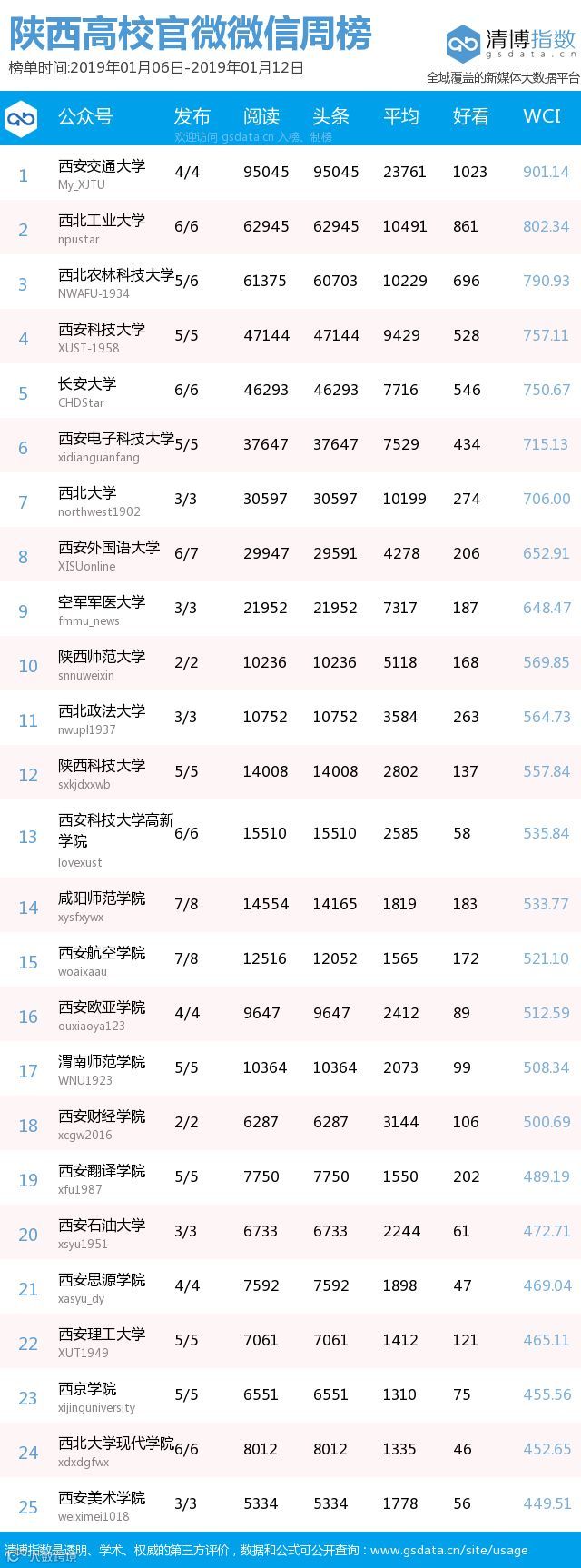 ● 本期陕西教育类新媒体周榜包含以下四个榜单:依次为陕西省教育部门官方微信周榜TOP25、陕西高校官方微信周榜TOP25、陕西高校自媒体周榜TOP10、陕西教育培训机构微信周榜TOP10。更多行业新媒体榜单可登陆清博指数官网查询:www.gsdata.cn.