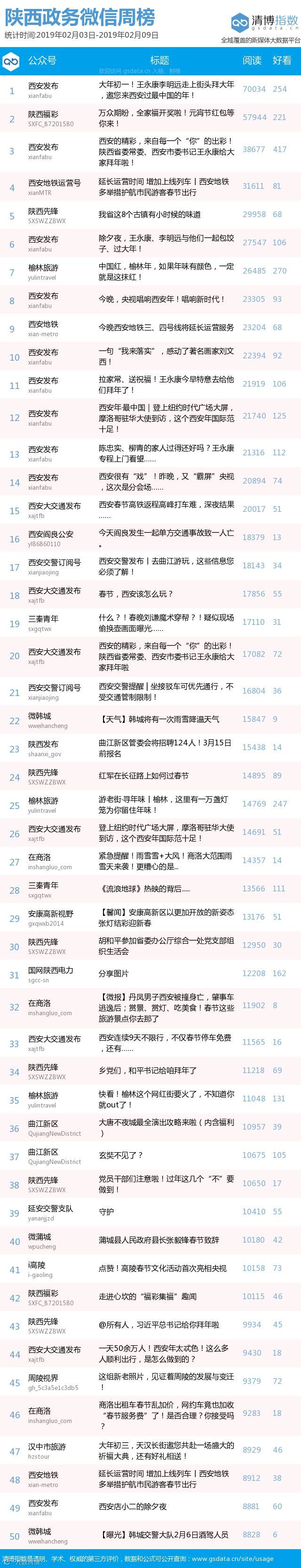 最新陕西政务微信公众号50强重磅出炉!TOP50上周共计发文713篇,阅读总量达229万+,好看总量12779,本周数据相较上周有所下降,希望下期各大平台能继续加油哦!