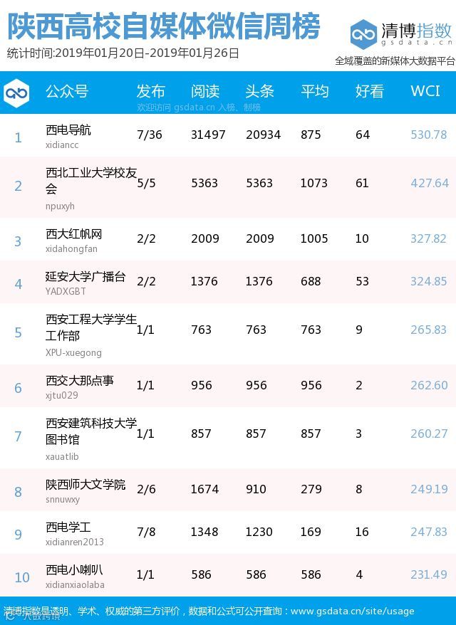 ● 本期陕西教育类新媒体周榜包含以下四个榜单:依次为陕西省教育部门官方微信周榜TOP25、陕西高校官方微信周榜TOP25、陕西高校自媒体周榜TOP10、陕西教育培训机构微信周榜TOP10。更多行业新媒体榜单可登陆清博指数官网查询:www.gsdata.cn.