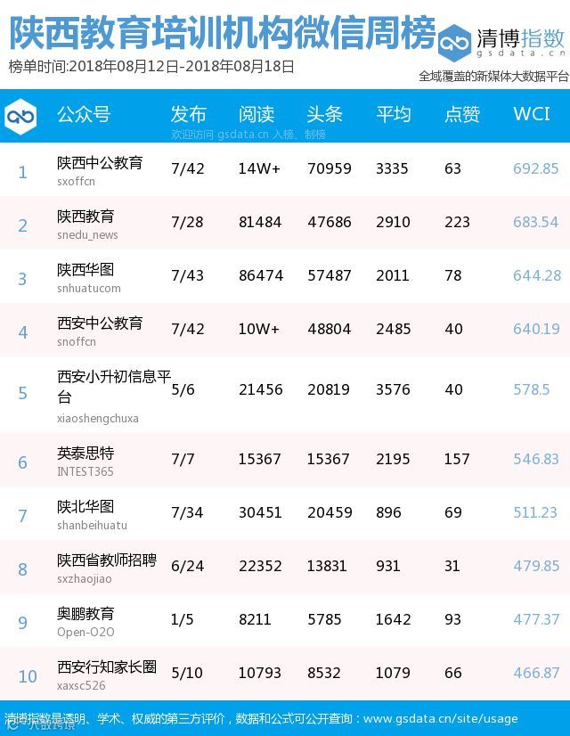 ● 本期陕西教育类新媒体周榜包含以下四个榜单:依次为陕西省教育部门官方微信周榜TOP25、陕西高校官方微信周榜TOP25、陕西高校自媒体周榜TOP10、陕西教育培训机构微信周榜TOP10。更多行业新媒体榜单可登陆清博指数官网查询:www.gsdata.cn