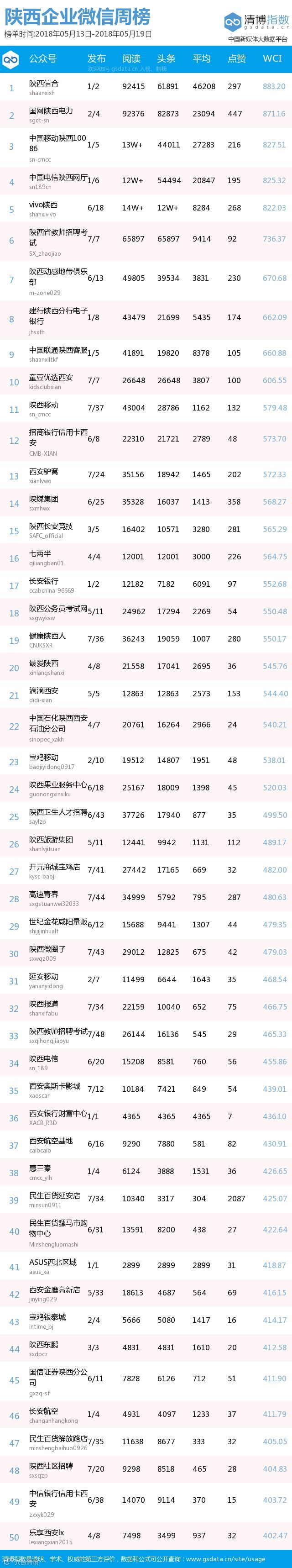 最新陕西企业类微信公众号50强重磅出炉!TOP50上周共计发文833篇,阅读总量达到151万+,点赞总量达到7479 。各项数据都有所回升。