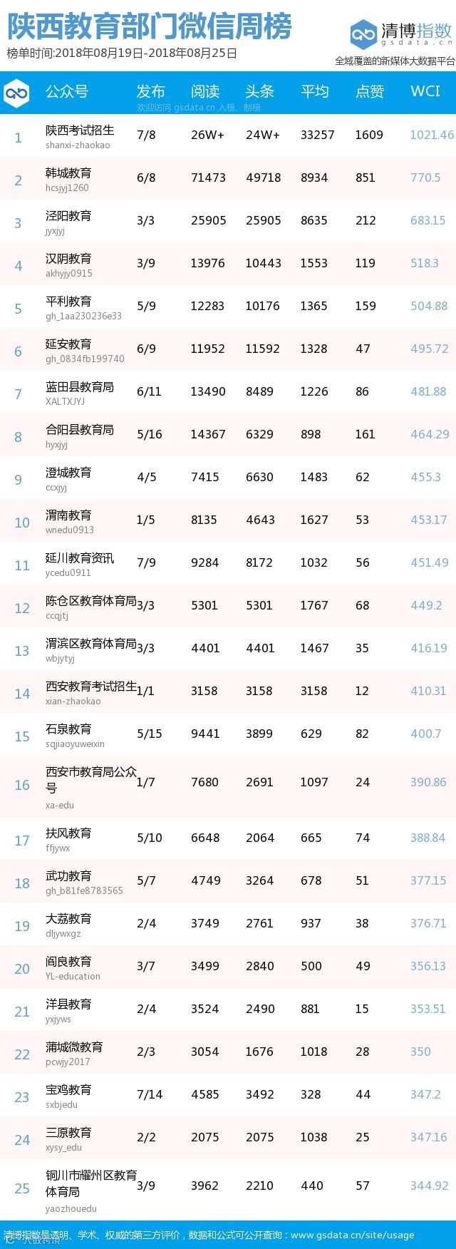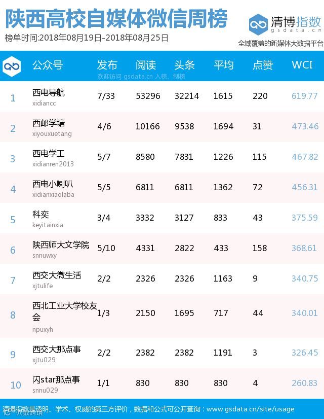 ● 本期陕西教育类新媒体周榜包含以下四个榜单:依次为陕西省教育部门官方微信周榜TOP25、陕西高校官方微信周榜TOP25、陕西高校自媒体周榜TOP10、陕西教育培训机构微信周榜TOP10。更多行业新媒体榜单可登陆清博指数官网查询:www.gsdata.cn