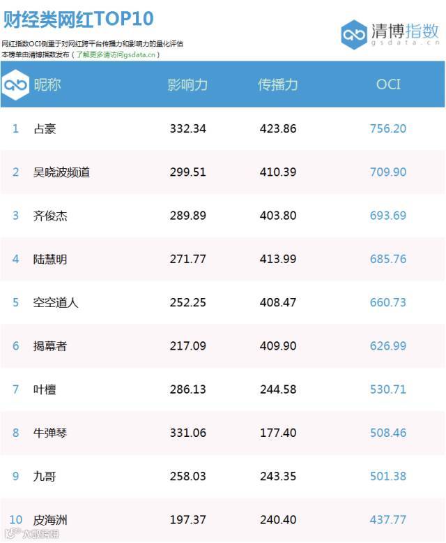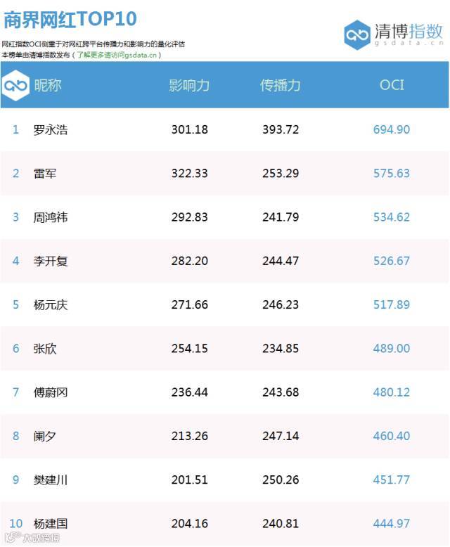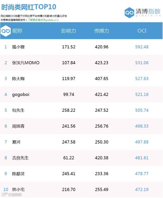 网红指数OCI(Online Celebrity Index):榜单公式以及数据说明,详情请登录网址www.gsdata.cn/site/usage#OCI