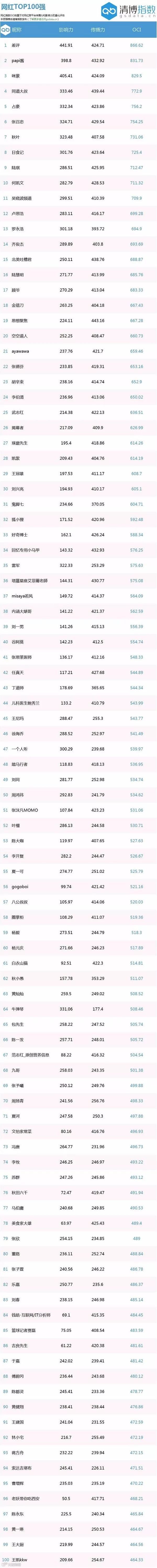 备注:网红指数OCI侧重于对网红跨平台传播力和影响力的量化评估,共包括三大维度、超过20项量化指标。本次榜单增加部分周期性指标,侧重考核周期内网红的传播力和影响力。
