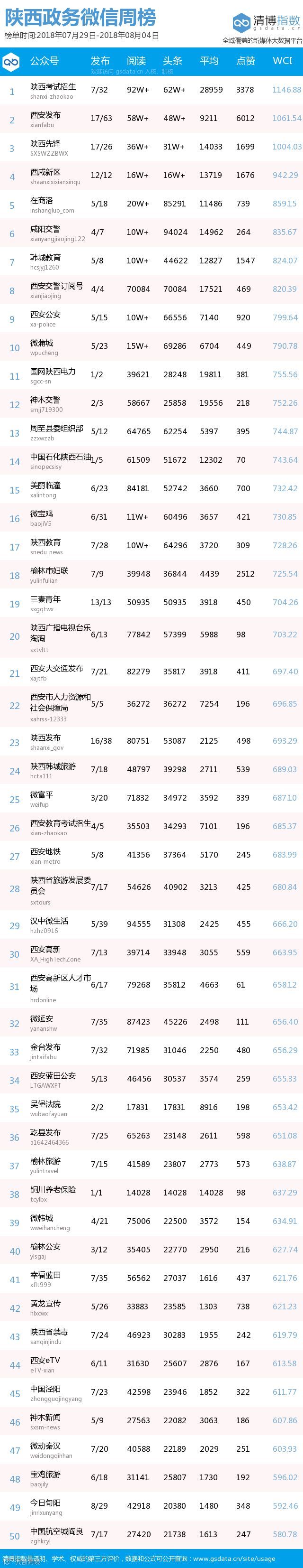 最新陕西政务微信公众号50强重磅出炉!TOP50上周共计发文916篇,阅读总量达492万+,点赞总量32448,相比较上周数据有所下降,希望下期各大平台能继续加油!
