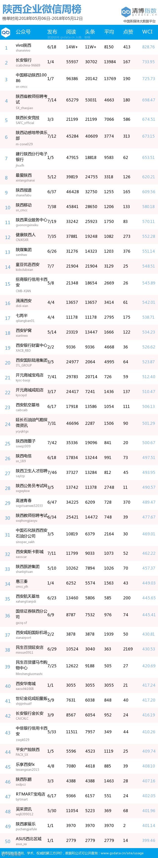 本期周榜中,“vivo陕西”、“长安银行”、“中国移动陕西10086”位居前三甲,表现优秀,实力强劲,WCI分别达到了828.76、733.95、725.73。