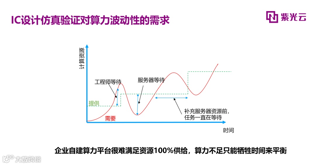 正是因为前后端设计有不同的要求,芯片设计企业对算力平台是有更高要求的。芯片设计对算力的需求是典型波动性的,在前端和后端分别存在波峰,尤其在规模比较大的芯片如CPU、GPU、人工智能、自动驾驶类芯片,在投片前的三个月,所有机器都会全负荷运转,但投片后很长时间机器会闲置。对芯片设计企业来说,自行搭建机器的成本是非常高的,因此越来越多的企业开始用云来解决算力问题。
