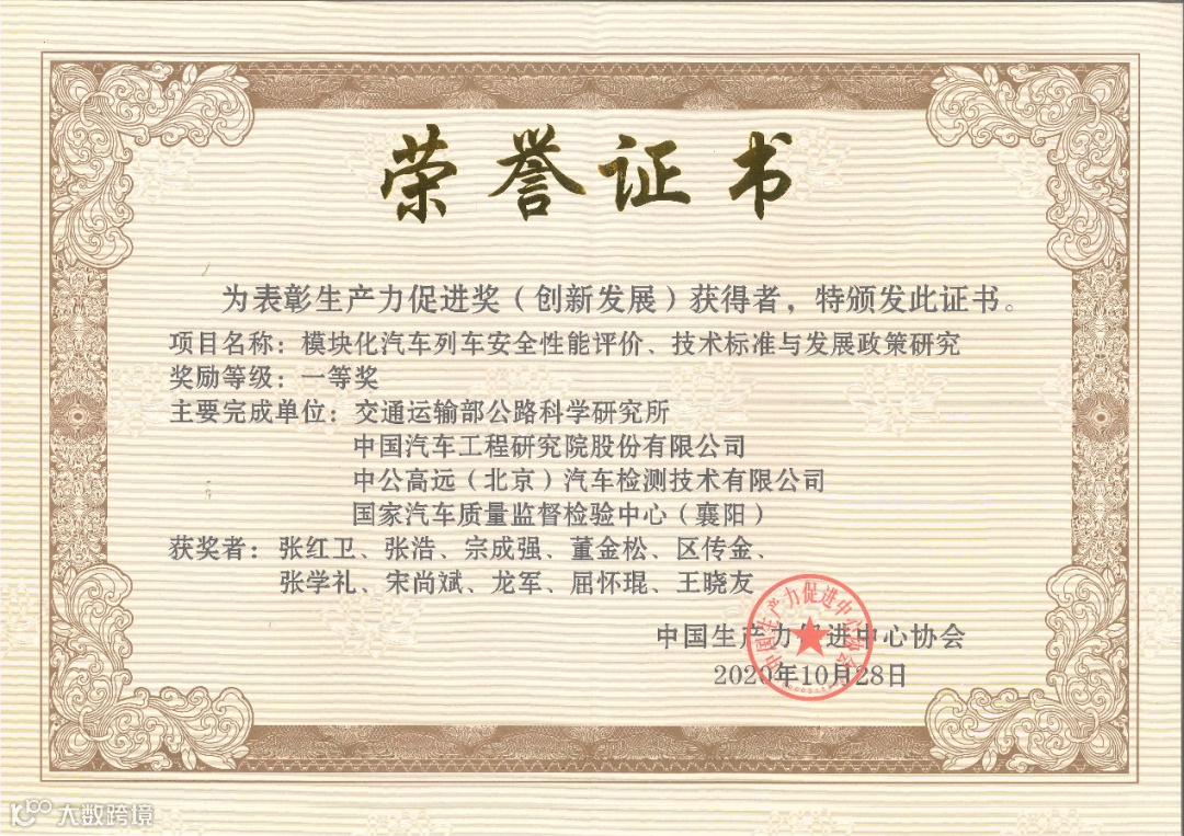 近日,由中国汽车工程研究院股份有限公司、交通运输部公路科学研究所、中公高远(北京)汽车检测技术有限公司、国家汽车质量监督检验中心(襄阳)联合申报的“模块化汽车列车安全性能评价、技术标准与发展政策”项目荣获中国生产力促进中心协会生产力促进奖(创新发展)一等奖。