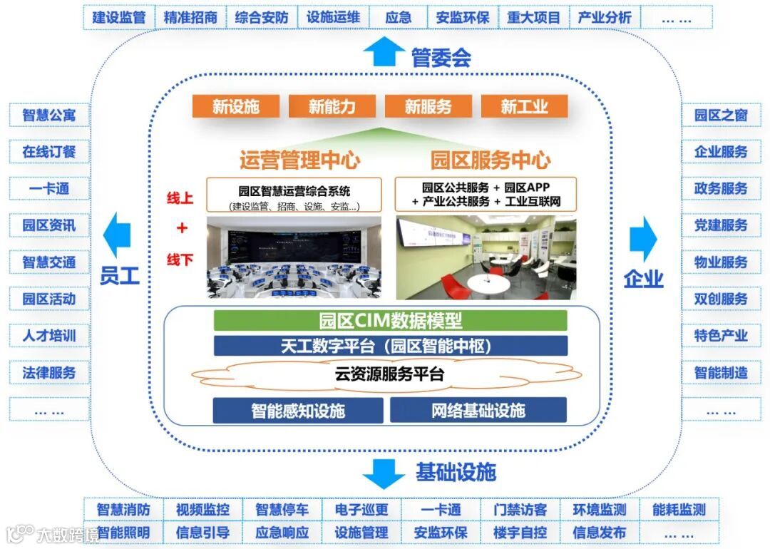 特别需要指出的是,这里的一套平台并非单指云平台或者大数据平台,而是包含智能基础设施、云平台、天工空间数字平台、园区CIM数据模型在内的数字产业园区核心支撑平台,是园区数字化的底座。详见下图。