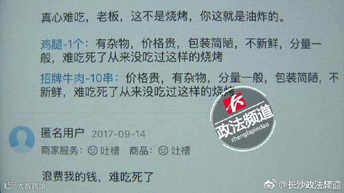 9月12日晚,长沙余女士通过一家订餐平台点了烧烤,吃过后感觉部分未烤熟,味道很一般,于是给了差评。9月15日晚,店家来了七八个年轻人,用铁棍将她和丈夫打伤。