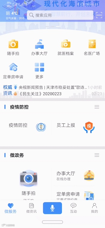 同时,为了快速响应政府的疫情防控任务,做好新区疫情防控工作的信息化支撑,“滨海掌上行" APP快速上线了“新冠肺炎疫情防控模块”专栏,充分利用信息化手段加强防疫工作,助力打赢疫情防控阻击战。