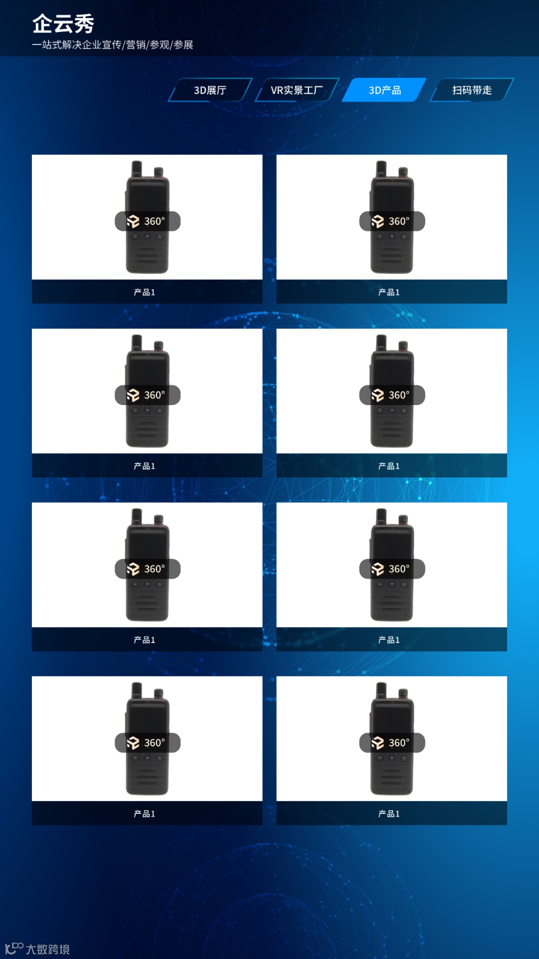 企云秀,为企业展示营销、参展参会、参观接待提供3D/VR一站式解决方案。企云秀解决⽅案通过3D/VR虚拟展厅+配套硬件+可定制化服务+私有化部署,多种营销组合⽅式,为企业建⽴更⾼效、更全⾯、更稳定的数字化营销系统。