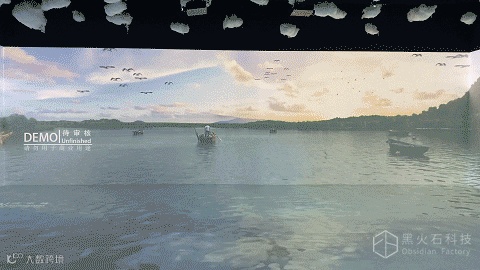 体验中心利用折幕投影,为参观者打造了一个BOX沉浸式空间,当参观者进入沉浸式空间后,无论观看哪个角度,都能感受到强烈的视觉冲击,让参观者切身感受喀什山林的春秋冬夏,欣赏饶河湿地的绝美风光。