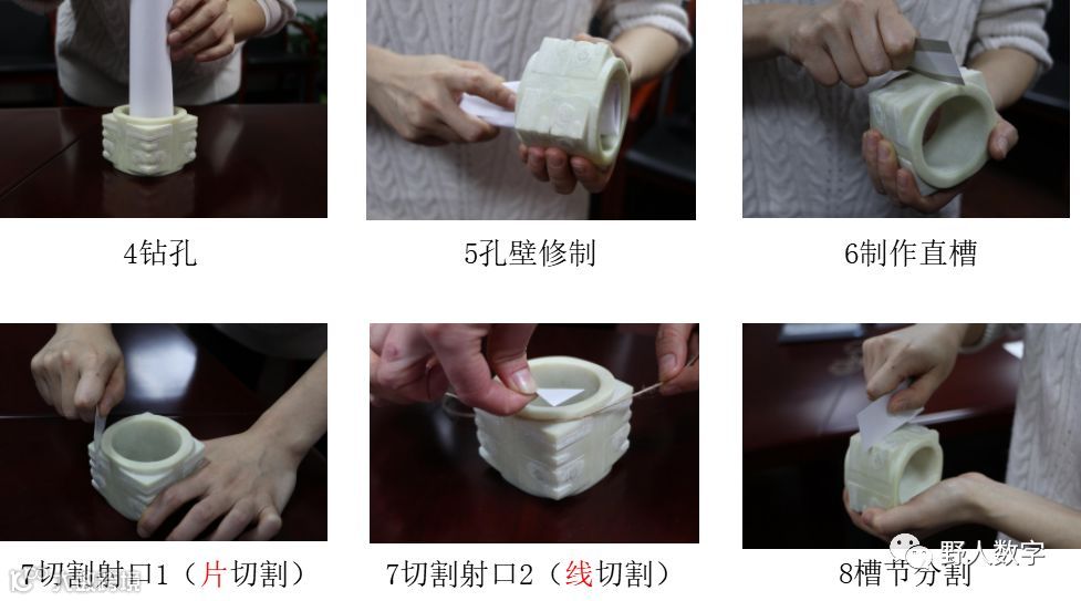 复刻的这些人物时,要先根据出土头骨等考古资料画出面貌,然后再根据考古所老师亲自演示的动作,3D建模数据打印出来。如凿玉的动作,钻孔、孔壁修复、制作直槽(一种工具),打印的人物手中切玉的细绳也都可以看得清清楚楚。