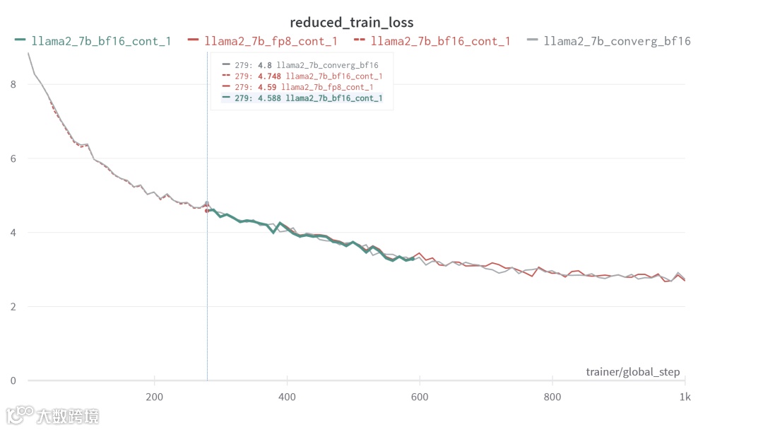 图 10 展示了对 Llama2-7B 模型做 FP8 继续训练的效果。本测试并未进行长时间的训练,目的是在为了提供概念验证 (PoC, Proof of Concept)。图中共有四条曲线:灰色曲线代表全程使用 BF16 训练,其余三条线分别表示以 BF16 进行预训练,保存 checkpoint 后,再分别以 BF16 与 FP8 继续训练。从继续训练的两条曲线来看,loss 曲线高度一致,且与灰色曲线的趋势也保持一致。