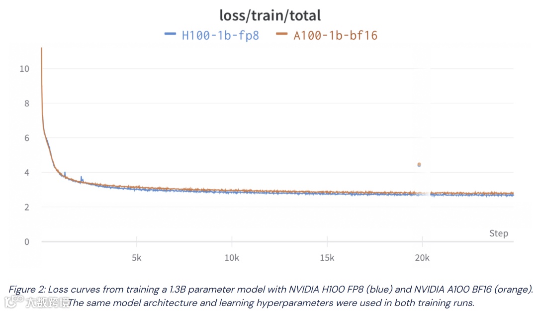 图 4 援引的是行业测试数据。左侧图表显示的是对 GEMM 单一计算任务的加速对比。在 H100 GPU 上 FP8 训练相对于 A100 GPU 上 BF16 训练的峰值性能加速比约为 6 倍,而在 GEMM 任务测试中接近 5 倍。并且鉴于底层 CUDA 内核持续优化,未来性能将进一步提升。