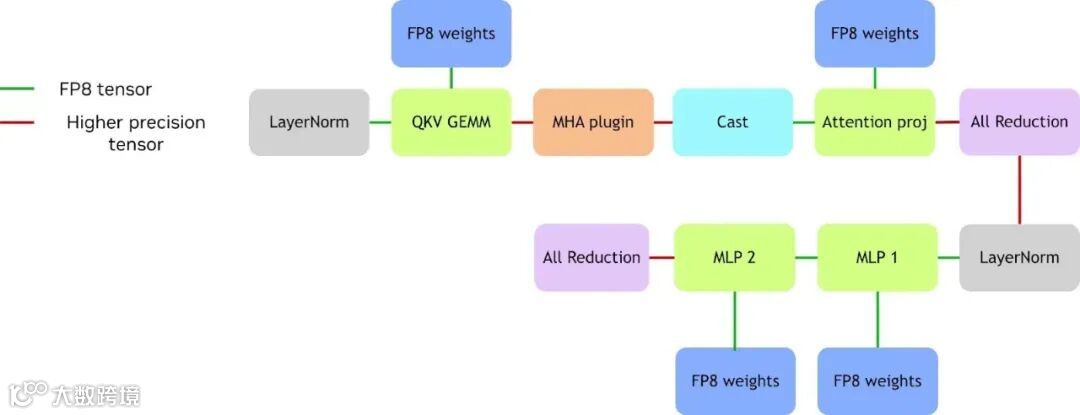 FP8 推理通过 NVIDIA TensorRT-LLM 实现,权重输入先转换为 FP8,并融合操作以提高内存吞吐,但部分输出仍需 FP16 进行 reduction。NVIDIA 技术团队正研究直接 FP8 reduction 以实现端到端的加速优化。