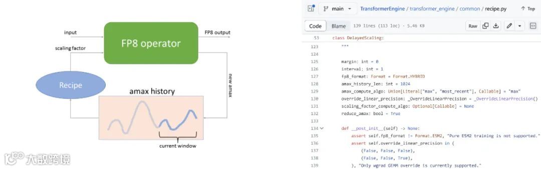 以该图展示的 amax history 说明,针对当前 tensor,系统可存储 1,024 个 amax 值,并从中选取最大值作为当前 tensor 的 amax 值。随后,根据一个简化的 recipe 算法即可计算出 scale 值。