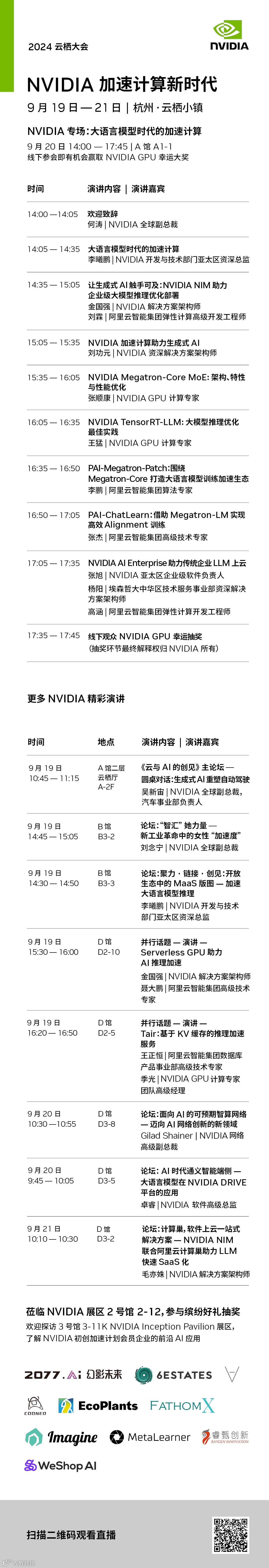 与此同时,2 号馆 NVIDIA 展区,将带来数据中心级的端到端技术栈、生态加速项目、LLM 技术演示、云上解决方案和用户实践,3 号馆 NVIDIA Inception Pavilion 展区邀请了 10 家亚太地区的 NVIDIA 初创加速计划会员企业展示前 AI 沿用。请跟随我们的脚步,先行了解 NVIDIA 如何亮相 2024 云栖大会!