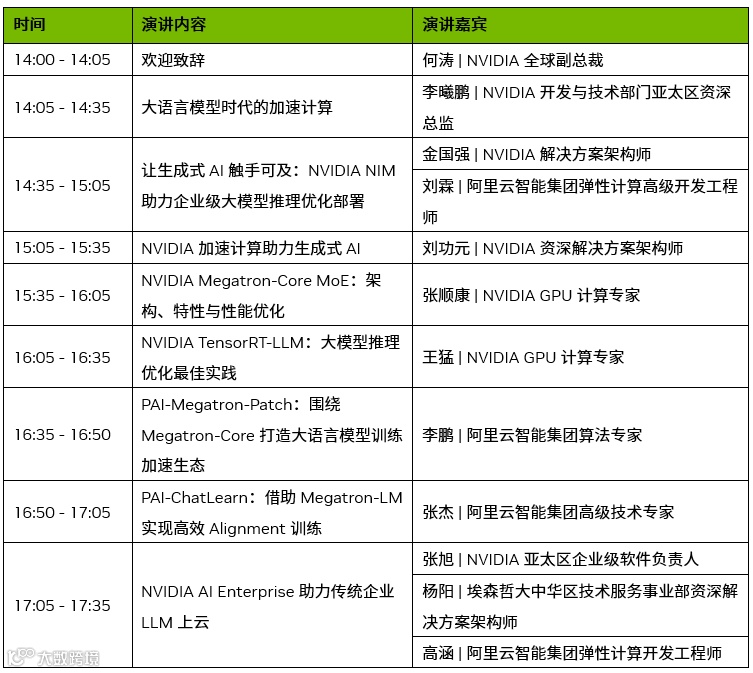 在NVIDIA 专场,NVIDIA 和阿里云、埃森哲的技术专家将分享大语言模型落地的关键要素,并分享全栈加速计算的技术经验。